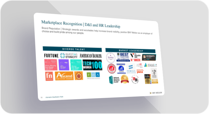 Marketplace Recognition | D&I and HR Leadership Brand Reputation | Strategic awards and accolades help increase brand visibility, position BNY Mellon as an employer of choice and build pride among our people. DIVERSE TALENT MARKET LEADERSHIP Information Classification: Public 11