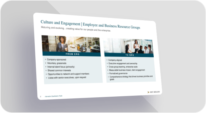 Culture and Engagement | Employee and Business Resource Groups Maturing and evolving…creating value for our people and the enterprise. FROM ERG TO BRG • Company-sponsored • Company-aligned • Voluntary, grassroots • Executive engagement and ownership • Internal talent focus (primarily) • Cross-group teaming, enterprise scale • Shared common interests • Measurable business impact, client engagement • Opportunities to network and support members • Formalized governance • Liaise with senior executives, upon request • Comprehensive strategy that drives business priorities and goals Information Classification: Public 7