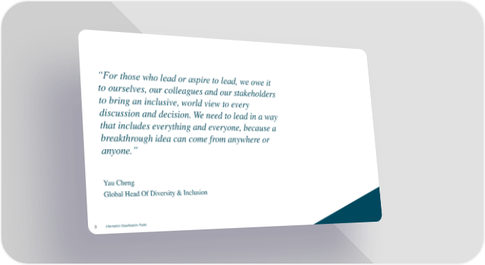 “For those who lead or aspire to lead, we owe it to ourselves, our colleagues and our stakeholders to bring an inclusive, world view to every discussion and decision. We need to lead in a way that includes everything and everyone, because a breakthrough idea can come from anywhere or anyone.” YauCheng Global Head Of Diversity & Inclusion Information Classification: Public 3