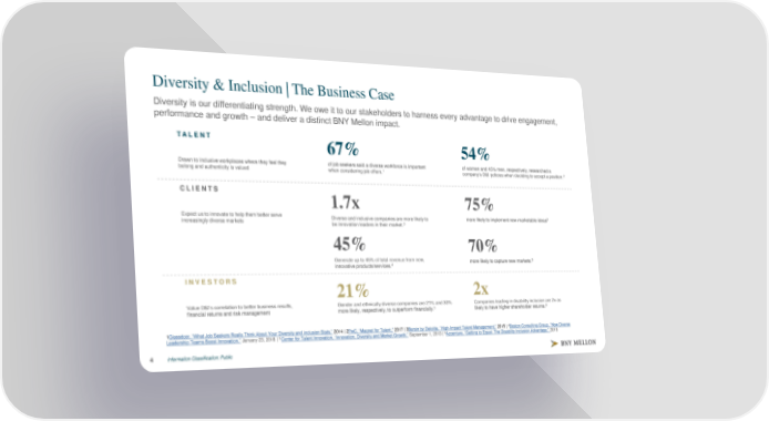 Diversity & Inclusion | The Business Case Diversity is our differentiating strength. We owe it to our stakeholders to harness every advantage to drive engagement, performance and growth – and deliver a distinct BNY Mellon impact. TALENT 67% 54% Drawn to inclusive workplaces where they feel they of job seekers said a diverse workforce is important of women and 45% men, respectively, researched a belong and authenticity is valued when considering job offers.1 company’s D&I policies when deciding to accept a position.2 CLIENTS 1.7x 75% Expect us to innovate to help them better serve Diverse and inclusive companies are more likely to more likely to implement new marketable ideas5 increasingly diverse markets be innovation leaders in their market.3 45% 70% Generate up to 45% of total revenue from new, more likely to capture new markets.5 4 innovative products/services. I N V E S T O R S 21% 2x Value D&I’s correlation to better business results, Gender and ethnically diverse companies are 21% and 33% Companies leading in disability inclusion are 2x as financial returns and risk management more likely, respectively, to outperform financially.5 likely to have higher shareholder returns.6 4 1Glassdoor, “What Job Seekers Really Think About Your Diversity and inclusion Stats,” 2014 | 2PwC, “Magnet for Talent,” 2017 | 3Bersin by Deloitte, “High-Impact Talent Management,” 2015 | Boston Consulting Group, “How Diverse 5 6 Leadership Teams Boost Innovation,” January 23, 2018 | Center for Talent Innovation, “Innovation, Diversity and Market Growth,” September 1, 2013 | Accenture, “Getting to Equal: The Disability Inclusion Advantage,” 2018 Information Classification: Public 4