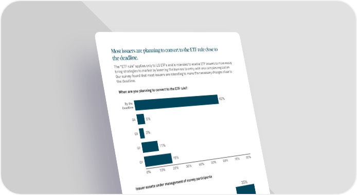 Most issuers are planning to convert to the ETF rule close to the deadline. The “ETF rule” applies only to US ETFs and is intended to enable ETF issuers to more easily bring strategies to market by lowering the barriers to entry with less complex regulation. Our survey found that most issuers are intending to make the necessary changes close to the deadline. When are you planning to convert to the ETF rule? By the 62% Deadline Q4 5% Q3 3% Q2 11% Q1 19% 0% 10% 20% 30% 40% 50% 60% 70% 80% Issuer assets under management of survey participants 40% 35% 30% 30% 24% 20% 11% 10% 0% $1mm - $1bn $1bn - $5bn $5bn - $10bn $10bn+ LEARN MORE If you have any questions or would like to know more, please contact your BNY Mellon relationship manager or email us at ETF@bnymellon.com.
