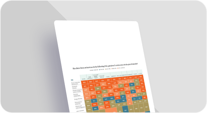 Has there been an increase in the following ESG questions from investors in the past 12 months? RANGE: 0%–9% 10%–19% 20%–29% 30%–39% 40%– and above l l l l l CONSUMER BASIC DISCRET- CONSUMER YES GLOBAL MATERIALS IONARY STAPLES ENERGY FINANCIALS HEALTHCARE INDUSTRIALS TECHNOLOGY TELECOM UTILITIES Board composition 50.7% 55.6% 61.5% 42.9% 50.0% 47.8% 55.6% 50.0 % 47.8.% 54.5% 60.0% and structure Diversity & 41.7% 55.6% 43.6% 32.1% 50.0% 44.9% 33.3% 36.4% 30.4% 27.3% 40.0% inclusion Climate change and 34.9% 48.1% 25.6% 42.9% 55.0% 37.7% 27.8% 43.2% 17.4% 27.3% 55.0% carbon emissions Executive 34.2% 29.6% 43.6% 28.6% 35.0% 42.0% 44.4% 31.8% 23.9% 45.5% 40.0% compensation Energy efficiency 30.7% 51.9% 23.1% 35.7% 45.0% 31.9% 22.2% 40.9% 15.2% 31.8% 40.0% Data protection 28.3% 11.1% 28.2% 14.3% 10.0% 40.6% 16.7% 29.5% 32.6% 22.7% 25.0% and privacy Pollution and 26.8% 59.3% 20.5% 50.0% 25.0% 17.4% 16.7% 31.8% 17.4% 18.2% 40.0% waste management Labor standards 24.3% 18.5% 30.8% 42.9% 25.0% 24.6% 22.2% 34.1% 21.7% 22.7% 25.0% Issues regarding the United Nations Sustainable 23.7% 25.9% 25.6% 32.1% 30.0% 29.0% 16.7% 20.5% 19.6% 27.3% 25.0% Development Goals (SDG) Voting rights 21.3% 33.3% 30.8% 28.6% 15.0% 29.0% 11.1% 20.5% 17.4% 31.8% 15.0% Bribery & 18.9% 7.4% 17.9% 25.0% 30.0% 33.3% 16.7% 22.7% 8.7% 13.6% 20.0% corruption Political contributions 11.8% 11.1% 7.7 % 7.1 % 15.0% 14.5% 11.1% 25.0% 0.0% 9.1% 30.0% & lobbying 19