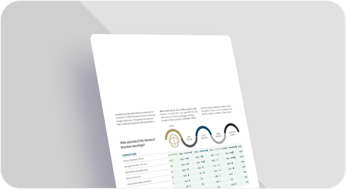 Interestingly, the data shows a mismatch of these meetings (83.3%). On the company side, 40.1% involved a member of their C-suite attendees at ESG-focused investor meetings. however, the main attendees were IROs (91.6%), management team in these meetings, only A high proportion of respondents reported with only 27.7% of the meetings involving 16.2% included a member of their board. that investors brought an ESG specialist to someone from a company CSR team. While GLOBAL Who attended ESG-focused ASIA LATIN NORTH WESTERN investor meetings? PACIFIC AMERICA AMERICA EUROPE COMPANY SIDE Investor Relations Officer 91.6% 82.6% 91.3% 100.0% 95.0% Management (CEO, CFO, etc.) 40.1% 34.8% 26.1% 43.8% 45.0% ESG/CSR/Sustainability team 27.7% 27.5% 34.8% 18.8% 55.0% Board of directors 16.2% 15.9% 8.7% 25.0% 10.0% Corporate/Company secretary 15.5% 8.7% 8.7% 31.3% 15.0% Legal counsel 6.3% 7.2% 0.0% 12.5% 0.0% Human resources 4.5% 5.8% 0.0% 6.3% 0.0% Other 3.1% 2.9% 4.3% 0.0% 5.0% INVESTOR SIDE ESG specialist 83.3% 85.5% 69.6% 87.5% 100.0% Portfolio manager 64.6% 49.3% 60.9% 75.0% 75.0% Equity analyst 55.2% 50.7% 78.3% 56.3% 50.0% Corporate governance/stewardship team 37.1% 34.8% 39.1% 43.8% 40.0% Other 0.6% 0.0% 4.3% 0.0% 0.0% 15