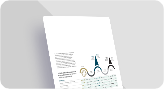 We observed in this survey IR teams’ significant engagement with debt investors and rating agencies, driven by respondents in Latin 62.7% America (53.3% and 62.7%, respectively) and Western Europe (51.6% and 38.7%, 53.3% RATING DEBT AGENCY respectively). By sector, Energy (both 55.0%), INVESTOR RELATIONS 51.6% Financials (52.2% and 60.9%) and Consumer RELATIONS DEBT 38.7% Staples (42.9% and 57.1%) companies showed INVESTOR RATING RELATIONS AGENCY a strong focus on communications with their RELATIONS debt investors and rating agencies, respectively. GLOBAL Which of the following are the responsibilities of the investor ASIA LATIN NORTH WESTERN relations department? PACIFIC AMERICA AMERICA EUROPE ENHANCED ESG/CSR communication with investors 71.3% 74.1% 74.7% 71.4% 67.7% Competitive analysis 63.9% 64.7% 50.7% 73.8% 35.5% Rating agency relations 40.7% 31.7% 62.7% 33.3% 38.7% Debt investor relations 38.8% 23.7% 53.3% 40.5% 51.6% Employee engagement 19.3% 23.0% 14.7% 23.8% 12.9% TRADITIONAL Financial disclosure development and reporting 75.9% 69.8% 94.7% 69.0% 77.4% Retail investor engagement 66.8% 70.5% 65.3% 59.5% 90.3% Engagement with investors and/or advisors 63.3% 55.4% 56.0% 76.2% 80.6% on proxy and voting Proxy and voting strategy 33.9% 32.4% 41.3% 26.2% 61.3% 8