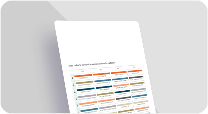 Issues ranked by perceived impact on overall market conifdence 2013 2015 2017 2019 1 GEOPOLITICAL RISK GEOPOLITICAL RISK GEOPOLITICAL RISK GEOPOLITICAL RISK 2 REGULATORY ENVIRONMENT CURRENCY EXCHANGE RATES CURRENCY EXCHANGE RATES GLOBAL TRADE ENVIRONMENT* 3 EUROZONE STABILITY EUROZONE STABILITY EMERGING MARKET GROWTH REGULATORY ENVIRONMENT 4 LIQUIDITY IN THE FINANCIAL MARKETS REGULATORY ENVIRONMENT EUROZONE STABILITY LIQUIDITY IN THE FINANCIAL MARKETS 5 EMERGING MARKET GROWTH EMERGING MARKET GROWTH GLOBAL TRADE ENVIRONMENT* CURRENCY EXCHANGE RATES 6 CURRENCY EXCHANGE RATES LIQUIDITY IN THE FINANCIAL MARKETS COMMODITY PRICES COMMODITY PRICES INCREASE IN DIRECT CORPORATE ACCESS REQUESTS FROM INVESTORS 7 COMMODITY PRICES COMMODITY PRICES REGULATORY ENVIRONMENT EMERGING MARKET GROWTH 8 INFLATION INFLATION LIQUIDITY IN THE FINANCIAL MARKETS EUROZONE STABILITY 9 TRADING TRANSPARENCY TRADING TRANSPARENCY INFLATION INFLATION * Global Trade Environment was added as an answer option in the 2017 Survey. 24